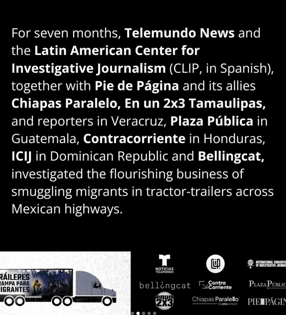 In addition to CLIP and Telemundo, the migrant trucks collaboration eventually included a number of partners throughout Mexico, Central America, and the Caribbean: En un 2×3 Tamaulipas, Pie de Página, Chiapas Paralelo, Plaza Pública in Guatemala, Contracorriente in Honduras, ICIJ in the Dominican Republic, and Bellingcat.