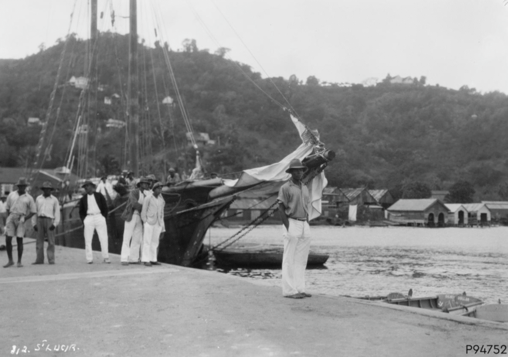 Historic photograph of workers at Castries harbor, St Lucia, circa late 1940s, representing the Caribbean origins of many Windrush passengers.